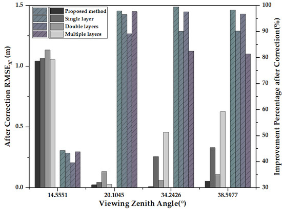 Table 5 shows that the RMSE values of most of the experimental images after the atmospheric refraction correction using the proposed SARCM were smaller compared with other state-of-the-art methods. In particular, in the x-direction, the geolocation accuracy after the atmospheric refraction correction using the proposed SARCM improved the most compared with the previous positioning accuracy, as shown in Table 5 and Figure 5. For example, for image 05, the geometric accuracy before the correction in the x-direction was 2.6150 m when the viewing zenith angle was 34.2406 After the correction using different atmospheric refraction correction methods, the most improvement was achieved with the proposed SARCM, which reduced the RMSE to 0.1000 m, an improvement of 99.5% compared with the original, while the least improvement was achieved with the multilayer method, which reduced the RMSE to 0.4585 m, an improvement of 82.5% compared with the original; the difference in geometric accuracy improvement between the different methods was 17%. In addition, the geometric accuracy correction in the y-direction was insignificant because the atmospheric refraction error was generated by the vertical orbit with an orbit inclination of 97.4, and the geometric error in the SDGSAT-1 TIS along-orbit direction was larger than that in the across-orbit direction.