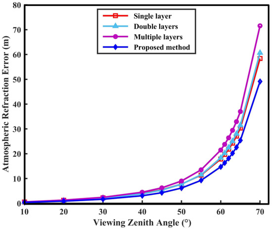 Furthermore, this study selected some typical atmospheric refraction correction methods, namely, the single-layer atmospheric model (atmospheric refractive index was 1.0002904 and the atmospheric height was 10.5 km), the double-layer atmospheric model (atmospheric refractive index was from the empirical atmospheric physical quantity model data and the atmospheric height was 47.35 km), and the multi-layer atmospheric model (atmospheric refractive index was from the empirical atmospheric physical quantity model data and the atmospheric height was 84.852 km), to compare with the proposed method [9,20]. The results of geometric positioning accuracy with these methods are shown in Table 5 and Figure 5 and Figure 6. Note that Table 5 and Figure 5 show the quantitative results of different atmospheric refraction correction methods, while Figure 6 gives only the numerical calculation results of the atmospheric refraction error.