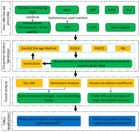 The specific steps of the research plan are as follows: (1) Data collection and processing: Meteorological, hydrological, DEM, NDVI, NPP and soil data were collected, and spatial interpolation and FVC were performed. (2) The precipitation storage method, RUSLE, RWEQ and Gill methods were used to simulate WR, SR, WD and GY of the TRHR from 2000 to 2019. (3) Sen and MK methods were used to study the spatial–temporal variation characteristics of the ecosystems services. (4) The dominance analysis method was used to study the spatial distribution characteristics of the dominant influencing factors of major ecosystem services, such as precipitation, air temperature, vegetation coverage and wind speed. (5) The correlation coefficient method was used to quantify the trade-offs and synergies between ecosystem services. (6) Based on the trade-offs and synergies between ecosystem services, and combined with the spatial distribution characteristics of the dominant influencing factors, we discussed the spatial differences in regulation and provision service enhancement measures (Figure 2).