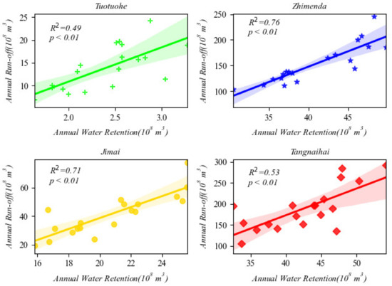 The water retention and runoff within the catchment area of a hydrological station are affected by precipitation at the same time, and the river runoff data can be used to verify the water retention in the catchment area. Using the total annual runoff data of the four hydrological stations of Tuotuohe, Zhimenda, Jimai and Tangnaihai, the simulation results of the annual water retention capacity within the catchment area of each hydrological station in the same period were verified. The results showed that the R2 of the annual runoff of the four hydrological stations and the annual water retention of the catchment area all exceeded 0.49 (p < 0.01), showing a good correlation (Figure 3).
