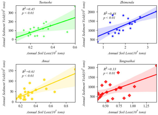 According to the sediment concentration monitoring data recorded at the four hydrological stations of Tuotuohe, Zhimenda, Jimai and Tangnaihai, we verified the simulation results derived using RUSLE. The results showed that, except for Tangnaihai Station, the R2 of three hydrological stations exceeded 0.30 (p < 0.01), which had a good correlation (Figure 4). The R2 of Tangnaihai Station is 0.33 (p < 0.01), because some reaches of the Yellow River are not in the TRHR.