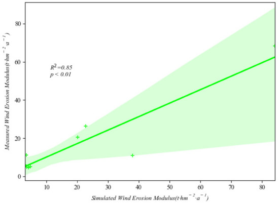 The wind erosion modulus simulation results have been well verified using the measured data of 9 137Cs isotope monitoring sites in western China from previous research [61]. The results show that R2 is 0.85 (Figure 5).