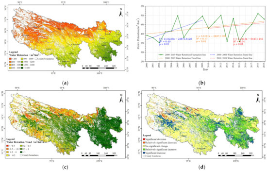 Spatial distribution of average annual water retention (a), inter-annual changes (b), change trend (c), and significance (d) of forest and grass ecosystems in the TRHR from 2000 to 2019.