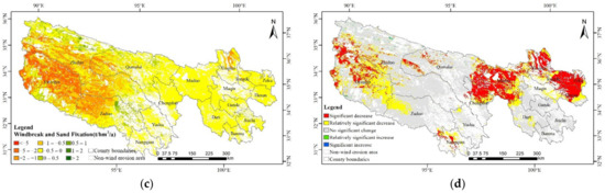 At the pixel scale, there were significant spatial differences in the interannual trends of windbreaks and sand fixation per unit area of the TRHR ecosystem from 2000 to 2019 (Figure 8c). The windbreak and sand fixation per unit area in most areas of TRHR showed a decreasing trend with time series, such as the central and northwestern regions of the TRHR, while the windbreak and sand fixation per unit area in some southern TRHR areas showed an increasing trend with time series. Except for non-wind erosion areas such as water bodies, bare rock gravel, glaciers, alpine canyons, etc., in the entire TRHR, the pixels with a decreasing trend of windbreak and sand fixation per unit area accounted for 89.73% of the total TRHR area. While the pixels with an increasing trend accounted for 8.99% of the total area of TRHR, and the pixels with no obvious change accounted for 1.27% of the total area of TRHR. The Geermu, Zhiduo, Zaduo, Qumalai, Maduo, Xinghai, and Zeku had a relatively obvious decreasing trends of windbreak and sand fixation per unit area, while parts of Jiuzhi, Zaduo, Zhiduo, Qumalai and Yushu had an obvious increasing trend of windbreak and sand fixation per unit area.