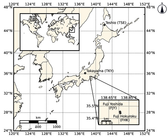 The current study was conducted at four forest sites (Teshio: TSE, Takayama: TKY, Fuji Yoshida: FJY, Fuji Hokuroku: FHK) in Japan between 2018 and 2020 (Figure 1 and Figure 2, Table 1). These four sites belong to AsiaFlux [44], Japanese Long Term Ecological Research Network (JaLTER) [45], and Phenological Eyes Network (PEN) [46].