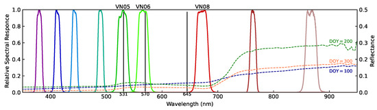 The relative spectral response (RSR) in the visible and near-infrared (NIR) range of Global Change Observation Mission-Climate (GCOM-C)/Second Generation Global Imager (SGLI). The original data was obtained from [58]. The solid black lines represent the wavelength at 531, 570 , and 645 , originally used to derive the photochemical reflectance index (PRI) and the chlorophyll carotenoid index (CCI). The blue, green, and orange dotted lines are reflectance measured by MS-700 at FHK on 9 April 2020 (DOY ), 18 July 2020 (DOY ), and 26 October 2020 (DOY ), respectively. Each reflectance was observed at 10:31:00 (Japan standard time (JST)) on each day.