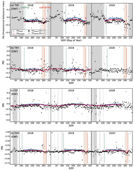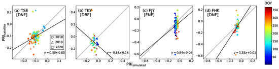 In addition to the outliers, the relatively tiny errors of , which fluctuated around the (hereinafter called “small noise”), also affected the results of the accuracy assessments. For example, in 2018 at TSE fairly matched with (Figure 7a); however, the scatter plot, including 2018, 2019, and 2020, shows the range of small noise in was approximately the same as the range of seasonal variations in (Figure 8a). Due to the small noise in , the features of seasonal variations in PRI became unclear.