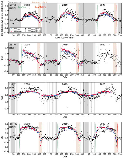 About the , Figure 9 shows that contained many outliers without the QA flag, but most of them were eliminated with the QA flag. Small noise was also contaminated with , but the seasonal trends of were clear even with small noise. The reason was that the range of seasonal variation of CCI was relatively large and it was not strongly affected by the small noise (Figure 10).