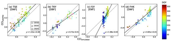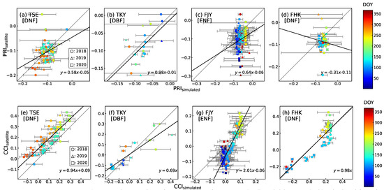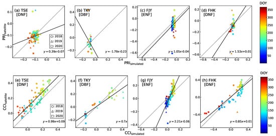 Scatter plots of snow-free PRI (a–d) and snow-free CCI (e–h). Satellite data were screened with the QA flag (QA ). Additionally, satellite data observed in snow seasons were manually removed. The dotted line represents the line. The black solid line is the linear regression line. The shape of each point represents the year. The color of each point corresponds to the DOY.