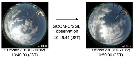 The sky images taken by upward ADFC around the observation time of GCOM-C/SGLI (10:46:44 (JST)) at FHK on 9 October 2019 (DOY = 282).