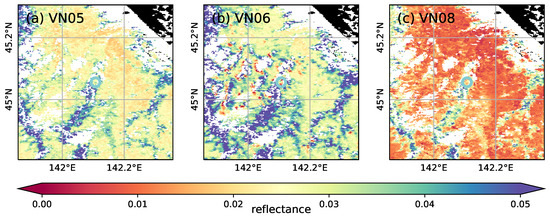 GCOM-C/SGLI level 2 atmospheric corrected land surface reflectance (RSRF) daily products, whose version was 3, were used as the satellite data. The spatial resolution of the bands in visible and NIR regions of the products was . The details of each band are described in Table 4. Note that some parts of the products are not released from JAXA at present because the major update for the products (from version 2 to version 3) started in November 2021, and it has not been finished yet. Hence, the authors created the RSRF products by applying version 3 algorithm for version 2 input data: the top of atmosphere radiance (LTOA) products. Certainly, version 2 LTOA products were not the latest; however, the difference in LTOA products between version 2 and version 3 was only tiny debugs. Therefore, the RSRF products used in our study can be regarded as the same as the latest RSRF daily products, which will be freely available on JAXA’s FTP server [60] (HDF5 format, WGS84 datum, sinusoidal projection). They included a quality assessment (QA) flag whose details are shown in Table 5.