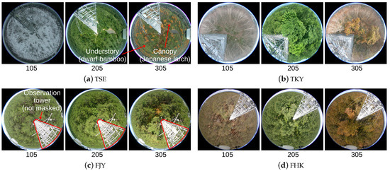 We also collected fisheye images of the vegetation with time-lapse cameras named Automatic-capturing Digital Fisheye Camera (ADFC) (Figure 3). ADFC is a combined system of a digital camera (COOLPIX4300 or COOLPIX4500, Nikon Corp., Tokyo, Japan), a fisheye lens (FC-E8, Nikon Corp., Tokyo, Japan), and a waterproof housing case. Fisheye images taken by ADFC have been used in many studies [50,52,56,57]. Figure 4 shows examples of the fisheye images.