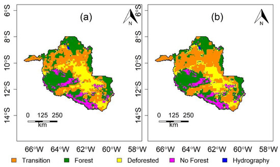 Land cover classifications according to PMDA for the years 2000 (a) and 2020 (b), Rondônia, Brazil.