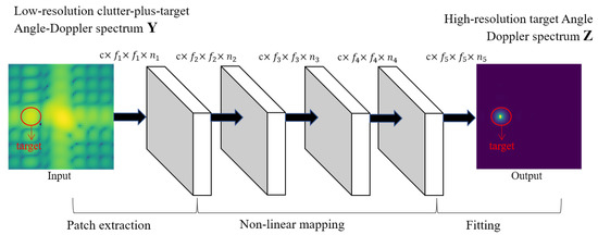 Based on the CNN-STAP [32], we constructed the convolutional neural network structure, as shown in Figure 3. The network consisted of five convolution layers. The input was the low-resolution clutter-plus-target spectrum estimated by Fourier spectrum transform, and the output was the high-resolution target spectrum estimated by MVDR spectrum transform after filtering out the clutter and noise.