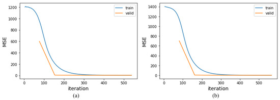 Training and validation MSE versus the number of iterations. (a) ideal case; (b) non-ideal case.