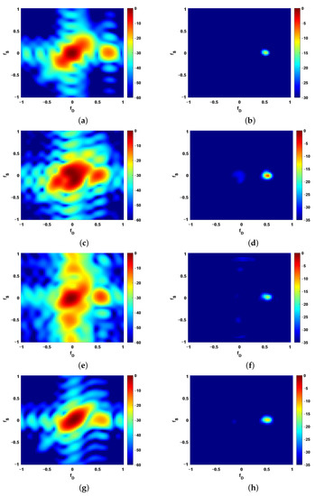 Processing results of different clutter environments with SCR = −15 dB in the case where the target and clutter are distinguishable. (a,b) ideal case; (c,d) in the presence of aircraft crabbing; (e,f) in the presence of spatial error; (g,h) in the presence of ICM.