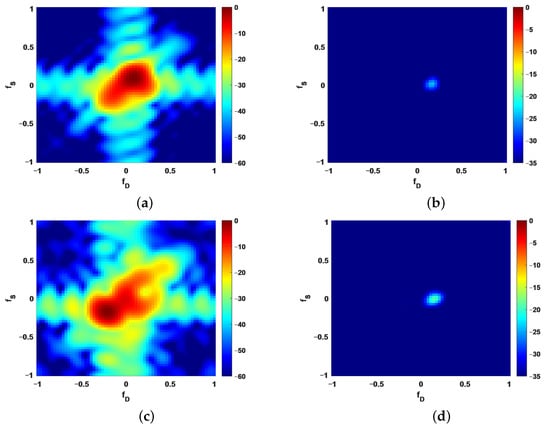 Processing results of different clutter environments with SCR = −15 dB in the case where the target and clutter are indistinguishable. (a,b) ideal case; (c,d) non-ideal case.