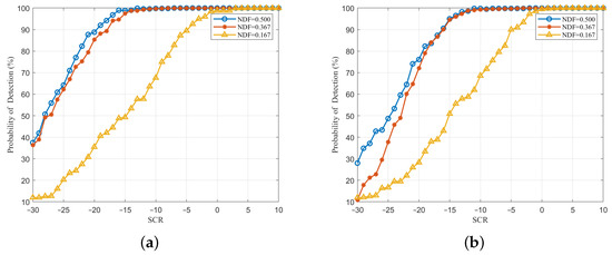 As depicted in Figure 7a,b, with the increase of SCR, the detection performance of the ETE-MTI method has improved. The three curves indicate that the ETE-MTI method have superior target detection performance whether in the mainlobe region ( = 0.1667) or in the sidelobe region ( = 0.367 or = 0.5) at the high SCR conditions. The PD approximately approaches in the sidelobe region ( = 0.367 or = 0.5) with the SCR of −15 dB. As the target’s NDF increases, the proposed method’s detection performance improves. It can be seen that the detection performance of the proposed method in the sidelobe region is better than that in the mainlobe region. It will degrade the target detection performance when the clutter exists with non-ideal factors. From Figure 7a,b, compared with the PD curves in the ideal case, the PD in the non-ideal case is slightly decreasing, although in non-homogeneous clutter environments, the PD can remain above in the sidelobe region ( = 0.367 or = 0.5) at −10 dB SCR. Thus, the results demonstrate that the ETE-MTI method has a good detection performance in the non-homogeneous clutter environments and low SCR conditions.