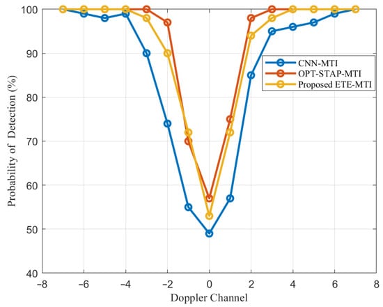 The comparison shows that the average PD of ETE-MTI exceeds that of CNN-MTI. Moreover, the ETE-MTI ’s PD curve is very close to that of OPT-STAP-MTI. Thus, the results demonstrate that ETE-MTI can achieve an excellent performance under different Doppler channels and excels in detecting low-speed targets. Furthermore, the ETE-MTI method will outperform the traditional STAP method when the training sample is limited.