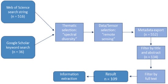 A structured literature search on forest biodiversity monitoring based on airborne or spaceborne remotely sensed spectral diversity has been conducted in the platforms Web of Science and Google Scholar. To derive an initial pool of relevant publications, a conditional search string integrating the foci on spectral diversity and remote sensing was developed in Web of Science (last access on 26 August 2022). Additionally, a keyword search on the full text in Google Scholar added further relevant articles (last access on 26 August 2022). Figure 2 depicts the full literature search and subsequent filtering to identify the final articles for review.
