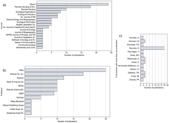 When aggregating all journals with a single publication (class “Others”), the total number amounts to 24 publications (Figure 4a). Interestingly, the journals with the second (Remote Sensing of Environment, Elsevier, 18 publications) and third highest number of publications (Remote Sensing, MDPI, 10 publications) both have a strong focus on remote sensing. The journals Ecological Applications (Wiley, 8 publications) and Ecological Indicators (Elsevier, 7 publications) come in fourth and fifth position, respectively.