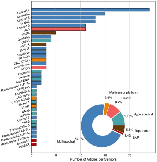 The analysis of spectral diversity from remote sensing sensors in the reviewed articles shows a wide range of sensors that have been used (Figure 7). In general, the different sensors can be categorized into active (LiDAR, SAR, topographic radar) and passive sensors (multispectral, hyperspectral). In comparison to active sensors, passive remote sensing sensors do not have their own energy source, i.e., they do not emit radiation. Moreover, passive sensors are measuring solar radiation that has been reflected by objects on the Earth’s surface, e.g., vegetation. The measured radiation is commonly detected in band lengths ranging from the visible light to shortwave infrared. In addition, passive sensors are specifically sensitive to atmospheric effects (e.g., clouds, haze), whereas active sensors emit radiation which is measured again once returned from an object. Active radar sensors which are most commonly operating in X- (2.5 to 3.75 cm wavelength), C- (5.43 to 5.66 cm wavelength), L- (20 to 60 cm wavelength), and P-band (60 to 120 cm wavelength) are rather insensitive towards atmospheric influences. In contrast, LiDAR sensors which are often emitting green or near-infrared light can not penetrate clouds [88,89,90].