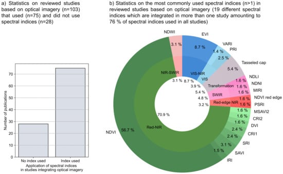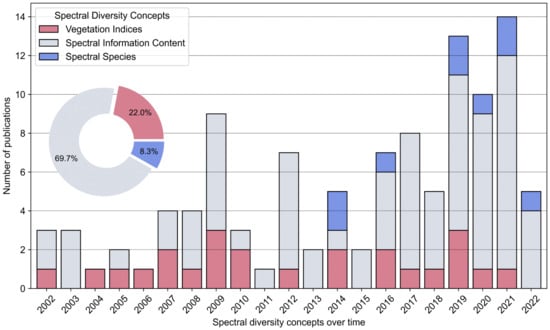 - As a final result, the thematic analysis (Section 3.5) covers the temporal distribution of spectral diversity concepts and presents the most frequently used spectral indices. In addition, the share of analyzed biodiversity scales (, , and diversity), and focus on flora/fauna is presented.