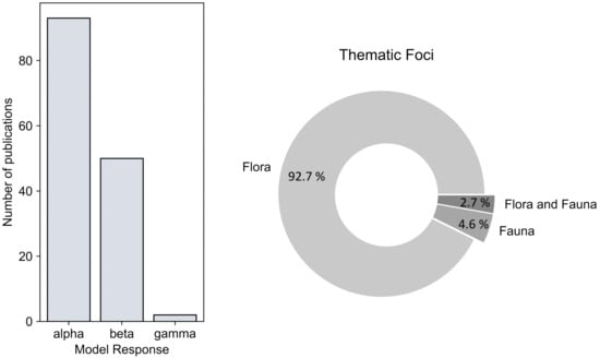 Figure 12 depicts the number of publications for different biodiversity scales (, , and diversity) and environmental foci (flora, fauna). Most of the studies are analyzing diversity (93 publications), followed by diversity (50 publications). There are 34 studies that conducted a combined analysis of and diversity. Landscape biodiversity ( diversity) is explicitly estimated in only two studies [117,127]. The analysis on environmental foci reveals that the majority (92.7%) of all reviewed studies analyzed floristic information to assess forest biodiversity. Only a small number of studies solely investigated fauna data (4.6%), and less than 3% of all reviewed studies conducted a combined analysis of flora and fauna. Most floristic studies estimated tree species diversity, e.g., [44,75,106,129,148,149,157], as a proxy of forest biodiversity. In contrast, some studies sampled understory vegetation (e.g., pterophytes) which are used as proxies for local tree species diversity since canopy building tree species are more challenging to identify [59,149,173].