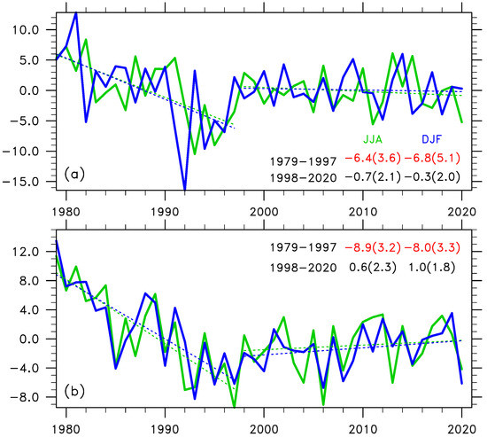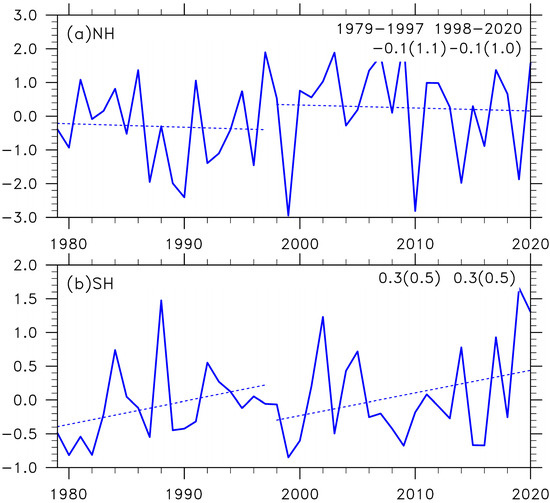 Time series of the BDC index averaged in winter over 1979–2020 in the (a) NH and (b) SH. The units are K m/s. The dotted lines indicate the linear regression over 1979–1997 and 1998–2020. The linear trends over 1979–1997 and 1998–2020 are marked in the upper right of each panel. Red and black values are statistically significant and insignificant, respectively, at the 95% confidence level using the Student’s t-test, with two σ uncertainties in brackets. The units for the trends are (K m/s)/decade.