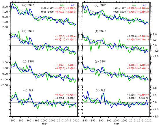 Time series of stratospheric temperature anomalies over 1979–2020 in the (a–d) NH and (e–h) SH in SSU channel (a,e) 3 (~40–50 km), (b,f) 2 (~35–45 km), (c,g) 3 (~25–35 km), and (d,h) TLS. The green and blue lines represent stratospheric temperature averaged in JJA and DJF, respectively. The units are K. The dotted lines indicate the linear regression over 1979–1997 and 1998–2020. The linear trends in JJA and DJF over 1979–1997 and 1998–2020 are marked in the upper right of each panel. Red and black values are statistically significant and insignificant, respectively, at the 95% confidence level using Student’s t-test, with two σ uncertainties in brackets. The units for the trends are K/decade.