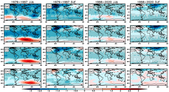 Geographic distributions of linear trends of stratospheric temperature over (left two columns) 1979–1997 and (right two columns) 1998–2020 in JJA and DJF in SSU channel (a–d) 3 (~40–50 km), (e–h) 2 (~35–45 km), (i–l) 1 (~25–35 km), and (m–p) TLS. Regions with dots are the places where trends have statistical significance levels higher than the 95% confidence level.