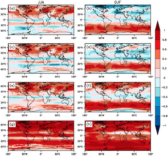 Geographic distributions of the correlation coefficients between stratospheric temperature and total column ozone over 1979–2020 in (a,c,e,g) JJA and (b,d,f,h) DJF in SSU channel (a,b) 3, (c,d) 2, (e,f) 1, and (g,h) TLS. Regions with dots are the places where correlation coefficients have statistical significance levels higher than the 95% confidence level.