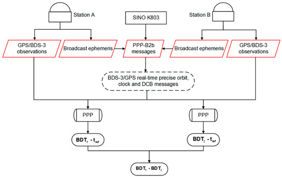 where indicates receiver clock of the local time of atomic clock (BDT) with respect to reference time (). Meanwhile, the hardware delay at the receiver end should be calibrated during GNSS data processing. Figure 1 shows the principle of the B2b-RTPPP.
