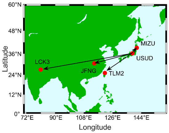 The Multi-GNSS Experiment (MGEX) stations distributed across China and its surrounding areas provide real-time observations of navigation satellite systems. To assess the B2b-RTPPP time transfer performance with different constellations, we collected PPP-B2b messages using the SINO K803 kit, over a seven-day period from 2 April to 8 April, 2022 (DOY 92–98, 2022). Software developed based on the RTKLIB software package was used to decode the PPP-B2b products according to the ICD [22] and test PPP method. The GBM final products were downloaded from the GFZ. Figure 2 presents the location of five selected stations. Note that USUD station was taken as the central node, and four time links (MIZU-USUD, TLM2-USUD, JFNG-USUD, and LCK3-USUD) were designed.