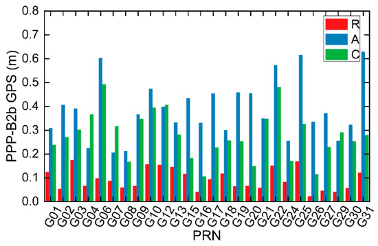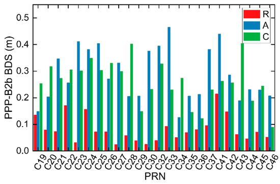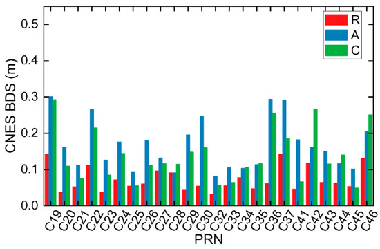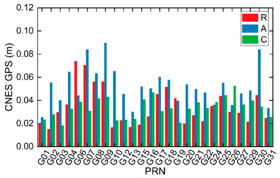 The average root mean square error (RMSE) was employed to indicate the accuracy of the orbits. Figure 3, Figure 4, Figure 5 and Figure 6 show the RMSEs of the PPP-B2b and CNES orbits in the R/A/C directions during the test period. The GBM final orbit product was used as the reference. The four figures show that the RMSEs of the CNES orbits are lower than those of the PPP-B2b orbits for both BDS-3 and GPS satellites, which is attributed to the fact that products from CNES are heavily reliant on global tracking stations, whereas those from PPP-B2b are primarily reliant on tracking stations in China [37]. As shown in Figure 4 and Figure 6, GPS satellites have smaller RMSEs for CNES real-time orbits in the R/A/C directions compared with those of the BDS-3 satellites. The RMSEs of GPS satellite orbits are within 0.10 m, and those of BDS-3 satellite orbits are within 0.30 m. Note that the CNES orbit has nearly the same accuracy in the three directions for GPS satellites. However, as shown in Figure 3 and Figure 5, for the PPP-B2b orbit products, the RMSEs of the BDS-3 satellite orbits in the R/A/C directions perform better than those of the GPS satellite orbits, especially in the A component, which potentially benefits from the implementation of inter-satellite link (ISL) technology [35]. Because ISL can effectively improve the orbit determination, which can further provide a more accurate satellite position, especially in the A direction. Furthermore, we can see that the R direction has a minimum RMSE, while the RMSEs in the A and C directions are large, approximately two to four times that in the R direction. Therefore, the orbit error is primarily coming from the A component, which has the greatest impact on the orbit accuracy. Note that the C31, C38, C39, C40, G05, G11, G14, G23, G28, and G32 satellites were excluded from the comparison because the information of these satellites (except C38, C39, and C40) were not included in PPP-B2b products during the test period. Additionally, the quality of the orbit and clock offset for IGSO satellites (C38, C39, and C40) was poorer than that for MEO satellites [25].