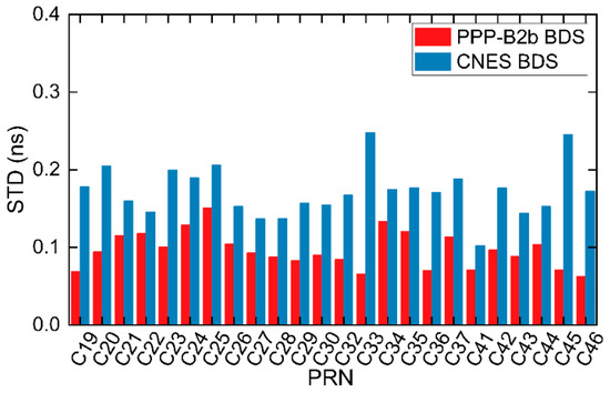 Owing to the above biases, the standard deviation (GNSS) was used to assess the accuracy of the PPP-B2b clock offset products. Figure 7 and Figure 8 show the average STD values of GPS and BDS-3 clock offset errors recovered from PPP-B2b and CNES over a seven-day period in the dataset. For the BDS-3 constellation, the average STDs of PPP-B2b and CNES are 0.10 ns and 0.17 ns, respectively. For the GPS constellation, the STD values of the PPP-B2b were comparable to that of the CNES, with average STDs of 0.11 ns and 0.09 ns, respectively. The average STD of BDS-3 is smaller than that of GPS for PPP-B2b, which also benefits from the ISL.