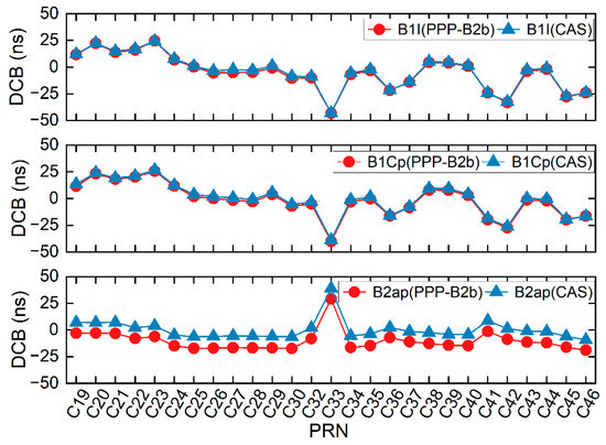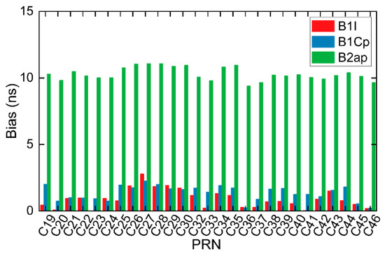Since three common DCB products were included in the PPP-B2b and CAS relative to the B3I signal (i.e., B1I-, B1Cp-, and B2ap-B3I DCB), only these three DCB products were evaluated. The PPP-B2b and CAS DCBs for each satellite are plotted in different colors in Figure 9. The PPP-B2b DCBs of B1I- and B1Cp-B3I showed good agreement with the CAS DCBs, while the B2ap-B3I DCB products indicated a strong systematic bias between PPP-B2b and CAS. We further summarized the biases of the PPP-B2b DCBs with respect to the CAS for each satellite, as shown in Figure 10. The B2ap-B3I DCB has the largest difference, with an average value of 10.31 ns. However, the differences of B1I- and B1Cp-B3I DCB are almost the same, with average values of 0.91 ns and 1.36 ns, respectively. The STDs of biases are 0.68 ns, 0.54 ns, and 0.48 ns for B1I-, B1Cp-, and B2ap-B3I, respectively. Obviously, B1I-B3I DCB has the lowest stability. Therefore, the accuracy of the PPP-B2b DCB should be increased soon.