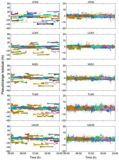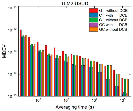 Figure 13 shows the modified Allan deviation (MDEV) of the TLM2-USUD time link. For the five schemes, the G, C, and GC B2b-RTPPP solutions demonstrated a relatively high similarity at the same averaging time, while the G B2b-RTPPP solution had the poorest frequency stability in the long term. The MDEV of GC B2b-RTPPP solution with DCB performed better than the other solutions for most of the averaging time. In terms of short-term frequency stability, the MDEV of the G without DCB, C with DCB, C without DCB, GC with DCB, and GC without DCB are (1.13 × 10−13, 4.06 × 10−14, 7.86 × 10−14, 3.62 × 10−14, and 6.18 × 10−14) at 960 s. In terms of long-term frequency stability for four time links, the MDEV of the G without DCB, C with DCB, C without DCB, GC with DCB, and GC without DCB are (6.52 × 10−15, 1.49 × 10−15, 6.17 × 10−15, 1.40 × 10−15, and 6.12 × 10−15) at 122,880 s. These findings of frequency stability are similar to the STD values of B2b-RTPPP solutions. The enhancements of GPS satellites to BDS-3 PPP are limited the PPP-B2b corrections. As our previous evaluation of the PPP-B2b product concluded, the quality of the GPS satellites is inferior to that of the BDS-3 satellites. In addition, the frequency stability improved as the averaging time increased. It should be noted that compared with the MDEV without DCB correction, the MDEV with DCB correction was similar in the short-term, while the B2b-RTPPP solutions with DCB demonstrated better long-term MDEV. The main reason for the frequency stability without DCB correction is that the large pseudorange residuals without DCB correction led to additional errors absorbed by the receiver clock offset. The frequency stability of the B2b-RTPPP solutions without DCB was significantly poorer at the TLM2-USUD time link than that of the B2b-RTPPP solutions with DCB, which is analyzed below.