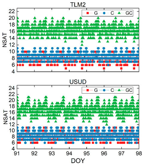 To verify the previous findings, the number of satellites involved in B2b-RTPPP at a cut-off elevation angle of 10° for the TLM2 and USUD stations during the test period are shown in Figure 14. The average number of visible satellites is 7.8, 8.6, and 16.4 for the G, C, and GC at the TLM2 station; and 8.3, 8.6, and 16.9 for the G, C, and GC at the USUD station, respectively. In addition, there were relatively fewer GPS satellites at the TLM2 station; up to five satellites at some epochs, leading to the appearance of outliers and reconvergence [43], as shown in Figure 15, which presents the clock difference between the two station clock offsets. The uncorrected DCB solutions had a slower convergence rate, which reduced the B2b-RTPPP time transfer. This also decreased the frequency stability. Note that a systematic bias was observed between the G and C B2b-RTPPP solutions, which was attributed to the different hardware delays absorbed by different IF combinations clock offset.