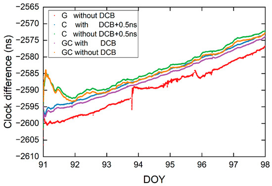 The reductions of the C and GC B2b-RTPPP solutions with DCB compared with that without DCB at the STDs of the clock difference are illustrated in Table 5. For the C B2b-RTPPP, the reductions of STD ranged from 49.3% to 73.6%, with a mean reduction of 64%. The reductions of GC B2b-RTPPP were almost the same as that of GC B2b-RTPPP. Therefore, the DCB had a great impact on the time transfer, which validated our previous findings. In addition, compared with G B2b-RTPPP, the reductions of the C and GC B2b-RTPPP solutions with DCB ranged from 69.0–80.1% and 70.6–81.3%, with a mean reduction of 76.7% and 77.7%, respectively. For the B2b-RTPPP without DCB, STDs were reduced by at least 14.5%, and by a maximum of 60.1% for C B2b-RTPPP. STDs were reduced by at least 14.6%, and by a maximum of 60.4% for GC B2b-RTPPP. Thus, the C and GC B2b-RTPPP performed better than the G B2b-RTPPP.