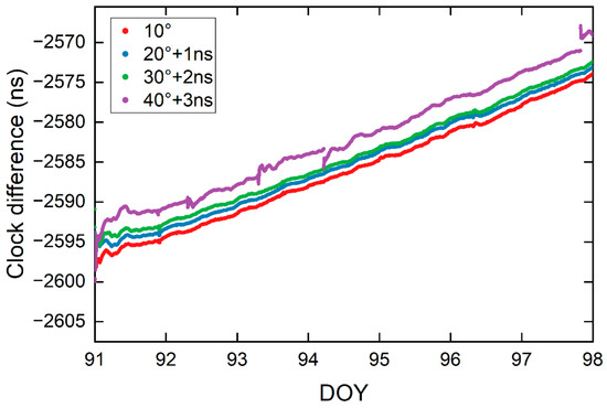 As we know, the receiver may be blocked artificially or naturally, which means less sky-view. In this case, fewer satellites can be observed by the receiver. Additionally, the cut-off elevation angle is an important preset parameter of PPP. Since the atmospheric delay error and multipath error become larger as the angle decreases, the possibility of uncontrollable factors appearing on the signal propagation path is also higher, so a large cut-off elevation angle can weaken the influence of the above errors as much as possible [44,45]. Considering that the PPP-B2b performance in terms of elevation angle is unknown, we conducted a time transfer experiment at different cut-off elevation angles to analyze its effect on B2b-RTPPP. The cut-off elevation angle ranged from 10° to 40°, with a step of 10°. On the basis of previous findings, we only carried out GC B2b-RTPPP time transfer to avoid frequent outliers and re-convergence of time transfer because of the lack of trackable satellites.