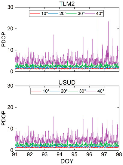 Figure 16 displays the clock difference of the TLM2-USUD time link. The sequence of clock difference substantially overlaps at 10°, 20°, and 30°, while the fluctuation range is larger at 40°, which is mainly due to the poorer spatial geometric distribution of visible satellites. In addition, the PDOP values of TLM2 and USUD stations are shown in Figure 17. As we can see, the PDOP values increase gradually as the cut-off elevation angle rises. The average PDOPs are statistically 1.4, 1.8, 2.7, and 5.0 for the TLM2 station, and 1.3, 1.7, 2.7, and 4.8 for the USUD station at 10°, 20°, 30°, and 40°, respectively. The sequence of PDOP values for the TLM2 station has a larger fluctuation at a cut-off elevation angle of 40°. Therefore, B2b-RTPPP can obtain a relatively great time transfer solution at a lower cut-off elevation angle in theory.