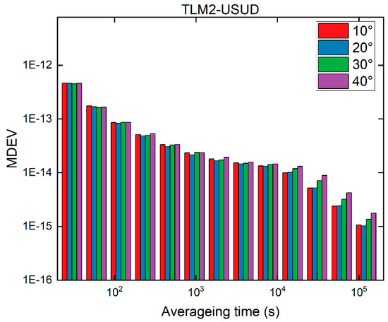 Figure 19 depicts the MDEV of the TLM2-USUD time link. No significant difference in the MDEV was observed in the short term. The MDEV of 10°, 20°, 30°, and 40° are 2.33 × 10−14, 2.14 × 10−14, 2.39 × 10−14, and 2.35 × 10−14 at 960s. The mean MDEVs of 10°, 20°, 30°, and 40° are 1.07 × 10−15, 1.03 × 10−15, 1.35 × 10−15, and 1.78 × 10−15 at 122,880 s. As the cut-off elevation angle increased, the long-term frequency stability decreased. In addition, the frequency stability of the TLM2-USUD time link outperformed those of other time links at the same averaging time. A possible explanation for this may be that the TLM2 and USUD stations are connected to atomic clocks with higher precision, which have lower noise level.