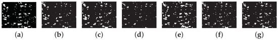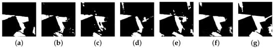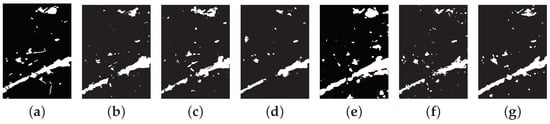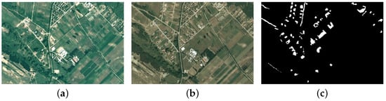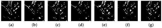 SZTAKI airchange benchmark: The second dataset, SZTAKI AirChange Benchmark (ACD), comes from the public dataset of the DEVA laboratory and contains 13 pairs of bi-temporal multispectral images. Each image has three bands of RGB, the image size is , and the spatial resolution is 1.5 m. All images provide ground truth maps for reference. The changed areas of this dataset mainly include newly built houses, construction areas, newly planted trees, new farmland, etc. In the ground truth map, white pixels are used to represent the above-mentioned changed areas, and black pixels are non-changed areas. At present, this public dataset has been widely used in the methods of other scholars. We also adopt the same training set division method as others, using 11 pairs of multispectral images as the network training set, and images from the two regions of Tiszadob and Szada for testing and validation. The ground truth maps of the ACD dataset used for testing and validation are shown in Figure 8 and Figure 9.