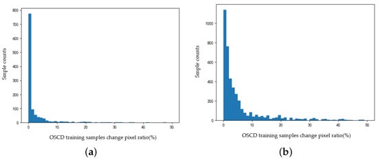 Distribution of change pixels in OSCD. (a) Before sample equalization. (b) After sample equalization.