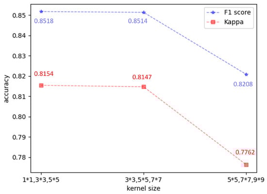 In order to test the influence of SCKB module on the results more comprehensively, we also designed a set of experiments on convolution kernel size. In previous experiments, the convolution kernel size was empirically set to , and . To test the effect of convolution kernel size on the results in SCKB module, we set the convolution kernel size to three different sizes, respectively, and carried out experiments on Tiszadob datasets. The experimental results are shown in Figure 18. It can be seen from the experimental results that the accuracy of the network decreases with the increase of the convolution kernel size in the SCKB module. This is because in the deep layer of the network, the size of the feature map gradually shrinks after convolution and pooling, and a small piece of the feature map represents the large-scale target in the original image. At this time, the features of large-scale target can be extracted using small or moderate convolution kernel for convolution operation. However, when using too large receptive field (such as ), the extracted features contain not only large-scale target, but also surrounding irrelevant information, so that the extracted features contain too much irrelevant information and reduce the accuracy of the network.