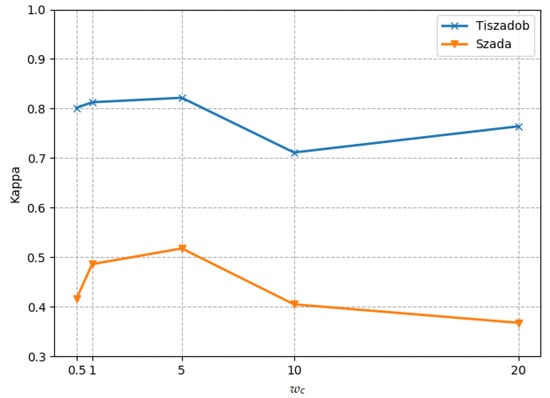 For the loss function of MSAK-Net, the class weight indicates how much the model pays attention to change samples during training. In multispectral images, the proportion of changing areas is small, and there is a problem of sample imbalance, which easily makes the loss function fall into the local optimal value. Therefore, the class weight plays an important role in the training process of MSAK-Net. To verify the impact of on change detection, we explore the experimental results of different on the SZTAKI dataset, as illustrated in Figure 19. When is 0.5, MSAK-Net pays more attention to non-changing samples on training, and it is easy to increase Recall and Kappa. As increases, the detection rate for changing samples increases, hence the performance is improved. It is worth noting that Kappa reaches its maximum value when is 5, which means that the effect of changing samples reaches a state of equilibrium. However, the Kappa evaluation metrics show a downward trend with the further increase of parameter . Hence, we set to 5.