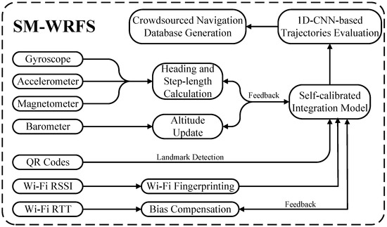 The main structure of this work is arranged as follows. Section 2 details the low-cost-sensor-based 3D indoor localization and deep-learning based Wi-Fi navigation database construction. Section 3 introduces the self-calibrated indoor localization models and multi-source integration structures. Section 4 describes the experimental results of the proposed SM-WRFS. Section 5 concludes this paper.