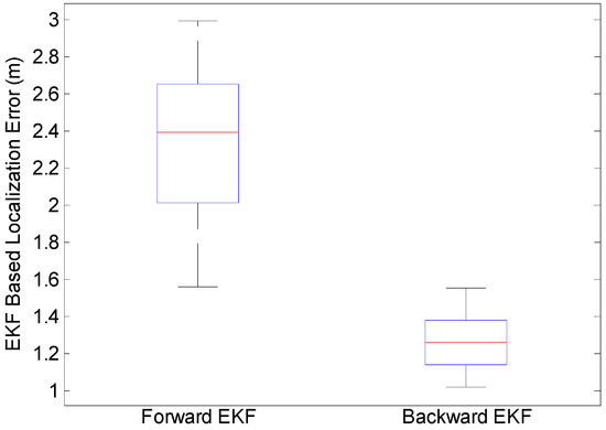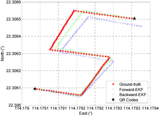 It can be seen in Figure 6 that the proposed backward EKF effectively improves the performance of forward trajectories, and the average positioning error decreased from 2.4 m to 1.2 m.