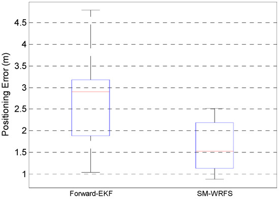 Figure 13 describes the positioning errors comparison under complex 3D indoor environments using uncalibrated forward-EKF model and final self-calibrated model SM-WRFS which reach 3.18 m in 75% and 2.19 m in 75%, respectively.